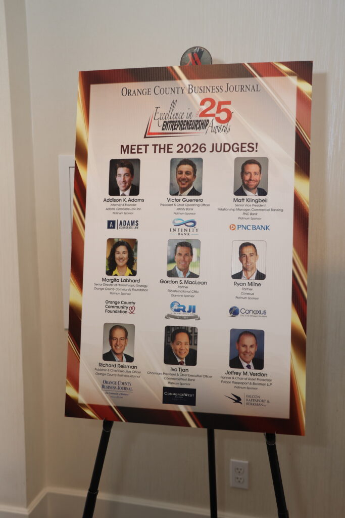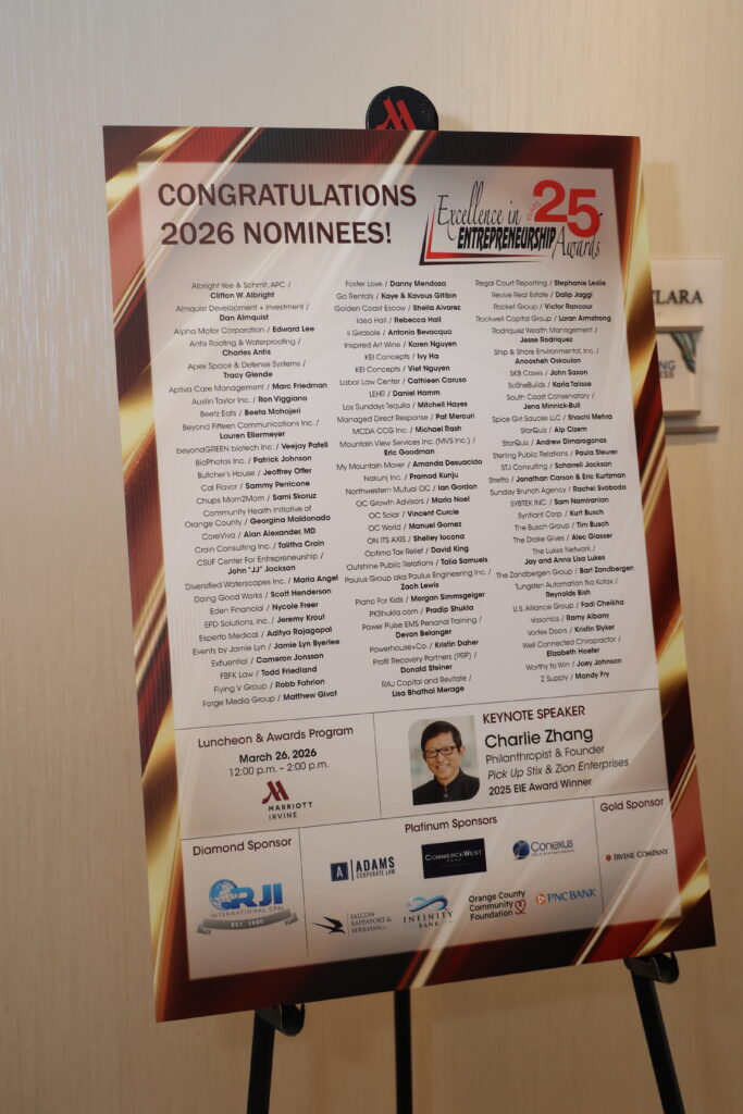 For 25 years, the Excellence in Entrepreneurship Awards has honored the risk-takers and visionaries who have shaped Orange County’s business landscape. From startups to global brands, these leaders have turned ideas into impact, built enduring companies, and inspired generations of entrepreneurs. This program is designed to recognize individuals who exemplify the American entrepreneurial spirit – individuals who, by their creativity and determination, have established and nurtured successful business ventures. Join us as we celebrate a quarter-century of entrepreneurial excellence and honor those who continue to lead the way forward.