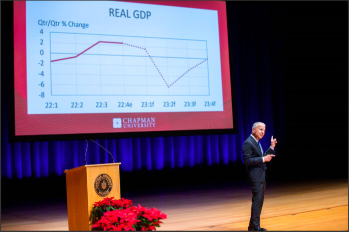 The Chapman researchers forecast the U.S. economy will contract 0.4% over the full year 2023, as measured by the real gross domestic product, versus an estimated 2% growth in 2022. They expect the recession to show up in mid-to-late 2023.