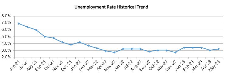 Orange County’s unemployment rate rose to 3.2% in May from a revised 3.0% in April and above the 2.7% rate seen in May last year, according to the state’s Employment Development Department.