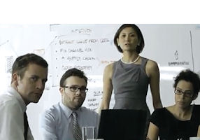 One of the ads features a client who gets a binder full of generic recommendations from traditional consultants and is left alone to figure out how to put a solution into practice. The spot cuts to a happy ending—the client hires RGP consultants, who get the job done.