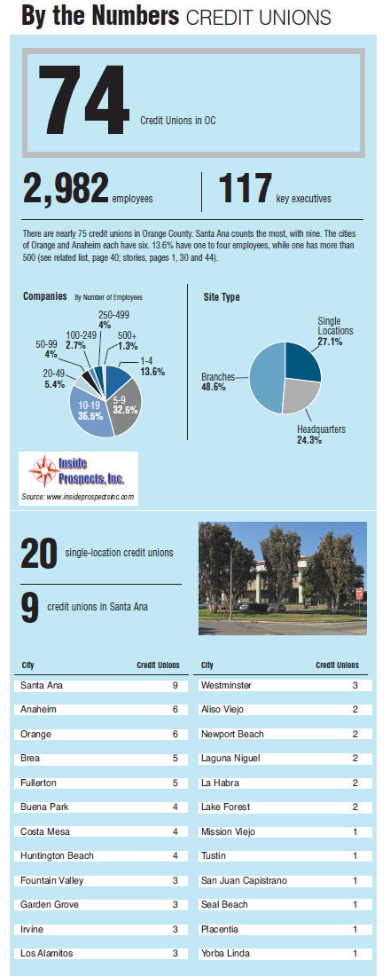 There are nearly 75 credit unions in Orange County. Santa Ana counts the most, with nine. The cities of Orange and Anaheim each have six. 13.6% have one to four employees, while one has more than 500.