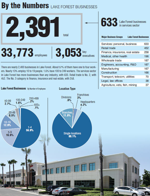 There are nearly 2,400 businesses in Lake Forest. About 57% of them have one to four workers.