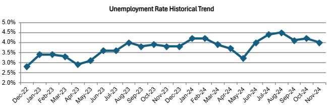 Orange County’s unemployment rate fell to 4.0% in November from a revised 4.2% in October and above the 3.8% rate seen in November last year, according to the state’s Employment Development Department.