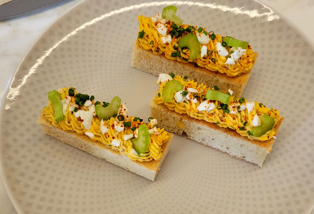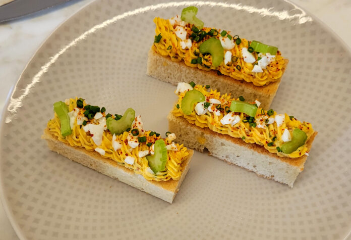 Dishes include house-made waffle potato chips; devil egg toast with brioche, mustard, chive and celery; panisse with chickpea and charred English pea emulsion; cod croquette with cod, potato and saffron aioli; black truffle brie with frisée, chive, truffle vinaigrette and a toasted baguette; Louis XV with hazelnut crunch, chocolate crémeux and gianduja glaze; and Knife Pleat’s famous box of six assorted macarons to take home.