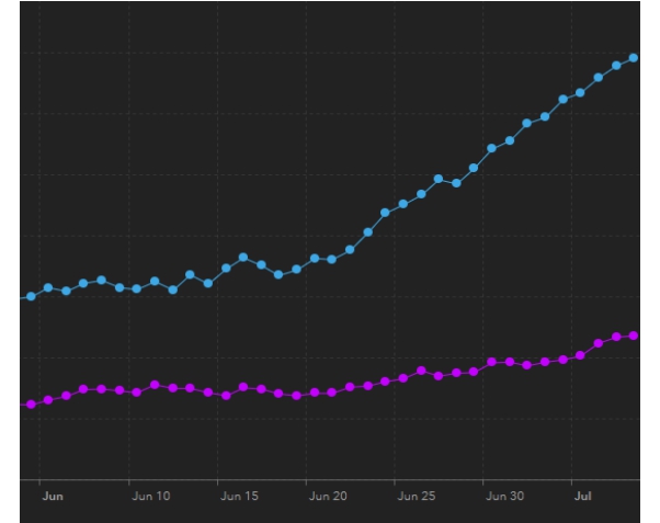 ICU patients are also increasing, albeit at a slower clip, with 211 patients each day on average in the week ending July 8, up 18% from the week prior.