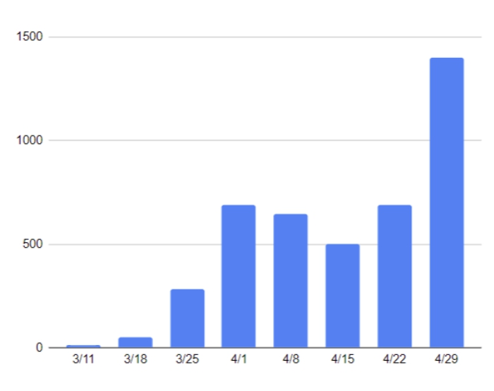 Nearly 1,400 people have been tested each day on average in the past week; that’s more than twice the previous high of 691 reached last week, in the seven days ending April 22.