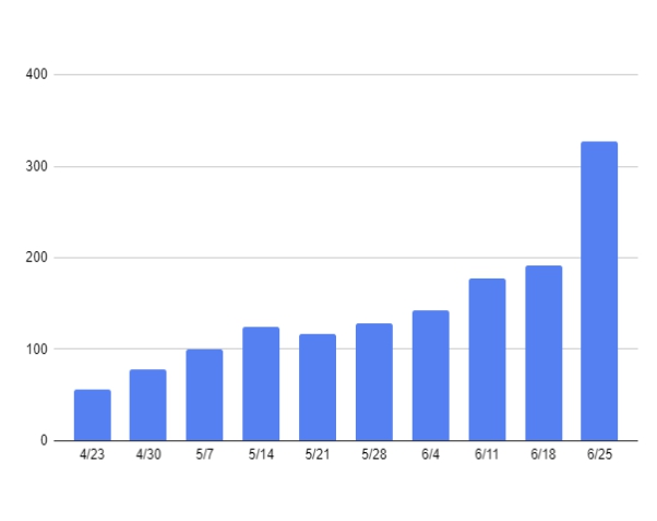 There are 394 cases currently hospitalized, including 147 ICU patients. In the week ending June 23, there have been 349 daily hospitalizations on average, up from 311 and 294 in the preceding two weeks.