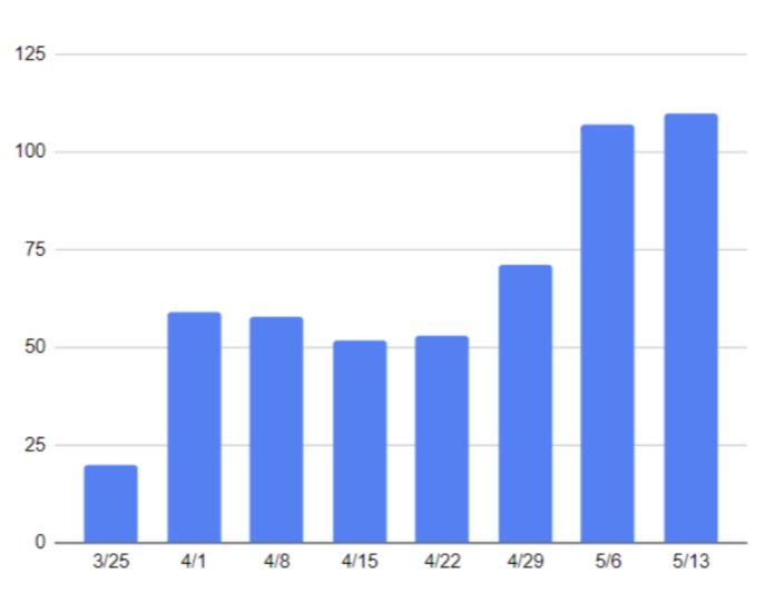 There were 110 new coronavirus cases reported each day on average in the past week, up slightly from 107 for the week ending May 6, and 71 for the week prior.