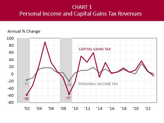 As shown in Chart 1, annual percentage changes in personal and capital gains tax revenues are highly volatile, especially during recessionary periods. The 2001 recession led to a 17% decline in personal income tax revenues and a 58% decline in capital gains tax revenues during California’s 2001-02 fiscal year.