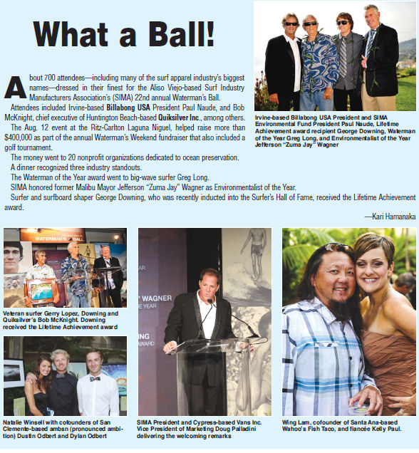 About 700 attendees—including many of the surf apparel industry’s biggest names—dressed in their finest for the Aliso Viejo-based Surf Industry Manufacturers Association’s (SIMA) 22nd annual Waterman’s Ball.