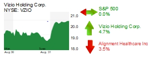 Shares in TV maker and media company Vizio Holding Corp. (NYSE: VZIO) in Irvine rose 4.7% to $20.43 apiece for a market cap of $3.8 billion. A report from Technavio Research released earlier today projected the television market will grow by $71 billion through 2025.Â