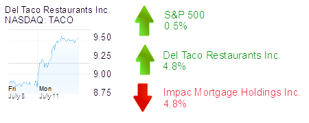 Lake Forest-based Del Taco Restaurants Inc. was up 4.8% to $9.44 and a $361 million market cap. The fast food chain began an exchange offer—common stock for warrants—to reduce the number of outstanding warrants.