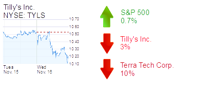 Shares in Irvine-based Tilly’s Inc. were down 3% to $10.20 and a $294 million market cap on light volume. The youth fashion apparel chain plans to report third quarter performance on Nov. 30.