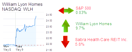 Newport Beach-based William Lyon Homes rose 9.7% to $24.10 and a $770 million market cap. The builder said net new home orders increased 26% in its first quarter orders, including a 48% jump in April.