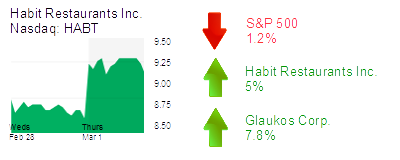 Habit Restaurants Inc. (Nasdaq: HABT) in Irvine was up 5% to $9.07 and a $236 million market cap. The fast-casual burger chain said yesterday that quarterly and annual revenue rose, net income was adversely affected by U.S. tax reform, and that it plans to open 36 to 38 restaurants this year, about 75% company-owned.