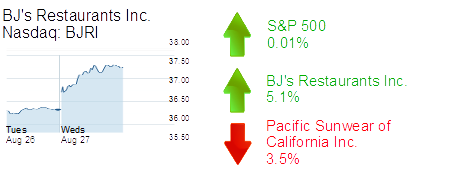 Huntington Beach-based BJ’s Restaurants Inc. was up 5.1% to $37.96 and a market cap of $1 billion. The casual restaurant chain said it would triple its share repurchase program announced April 22, from $50 million to $150 million. It’s also doubling its borrowing capacity from $75 million to $150 million.