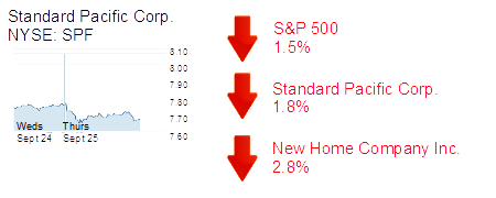 Irvine-based Standard Pacific Corp. was down 1.8% to $7.60 and a market capitalization of $2.2 billion. Aliso Viejo-based New Home Company Inc. was down 2.8% to $13.08 and a market cap of $219 million. Irvine-based Tri Pointe Homes Inc. and Newport Beach-based William Lyon Homes were each down just less than 1% to market caps of $2.2 billion and $725 million, respectively.