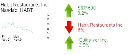 Habit Restaurants Inc. was down 6% to $34.44 and a market cap of about $860 million on profit-taking after its recent initial public offering. It went public last Thursday, rising that day from an initial pricing of $18 to $40 in after-hours trading.