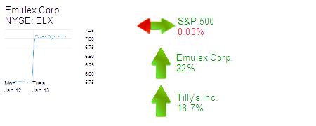 Costa Mesa-based Emulex Corp. was up 22% to $7.08 and a $505 million market cap. The networking products maker said preliminary results for its December quarter show revenue of about $110 million instead of a previously announced $102 million to $108 million, and earnings of 4 to 5 cents per share, compared with an expected loss of up to 4 cents per share.