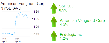 Newport Beach-based American Vanguard Corp. was up 4.3% to $11.35 and a $333 million market cap. The company bought the European business of a product called Nemacur from an Israel-based company and said it now owns the worldwide rights to the brand.