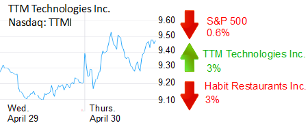 Costa Mesa-based TTM Technologies Inc. was up 3% to $9.48 and a $797 million market cap. The circuit board maker reported net income of $3.4 million on revenue of $329 million in its most recent quarter, compared with a loss of $3.8 million in the same period last year.