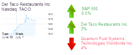 Del Taco Restaurants Inc. was up 3% to $15.68 and a $280 million market cap. The Mexican-themed fast food chain was formed yesterday when Levy Acquisition Corp. in Chicago closed its acquisition of Del Taco Holdings Inc. in Lake Forest.