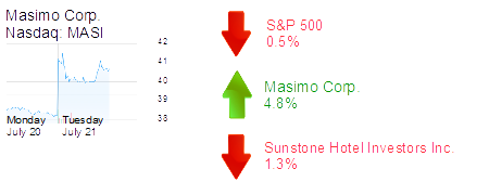 Irvine-based Masimo Corp. was up 4.8% to $40.51 and a $2.1 billion market cap. The device maker issued higher earnings guidance for its second quarter, the results of which are expected to be fully reported Aug. 4.