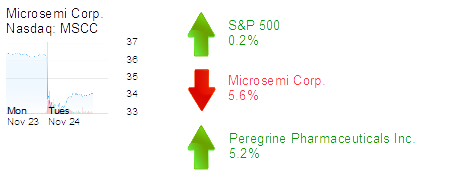 Aliso Viejo-based Microsemi Corp. was down 5.6% to $34.19 and a $3.3 billion market cap. The semiconductor maker agreed to buy PMC-Sierra Inc. in Sunnyvale for $2.5 billion.