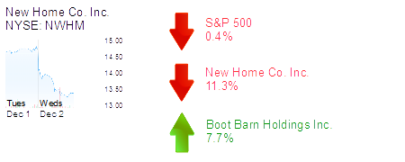 Aliso Viejo-based New Home Co. Inc. was down 11.3% to $13.06 and a $216 million market cap. The builder said it would offer up to 4 million shares of common stock and use the money for land acquisition and development and debt repayment. It current has 16.5 million shares outstanding.