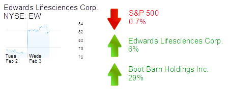 Irvine-based Edwards Lifesciences Corp. was up 6% to $81.54 and a $17.6 billion market cap on its quarterly report yesterday. The device maker beat expectations for its most recent quarter and hiked guidance for the current year.