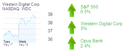 Irvine-based Western Digital Corp. was up 5% to $38.56 and an $11 billion market cap on above-average volume. Shares in the storage products maker have climbed 10% in the last two days as Western Digital said it would give updated 2016 guidance next week that accounts for its recent acquisition of SanDisk Corp.