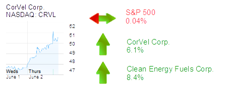Newport Beach-based Clean Energy Fuels Corp. was up 8.4% to $3.63 and a $383 million market cap. The natural gas provider said the city of Santa Monica had awarded the company a 5-year, $15 million contract to provide fuel for its city buses.