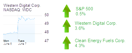 Irvine-based Western Digital Corp. was up 3.6% to $49.74 and a $14 billion market cap. Maxim Group upgraded shares in the storage products maker to “buy,” which followed yesterday’s reinstatement of coverage of the company’s stock by Goldman Sachs with a “neutral” rating and a $55 price target.
