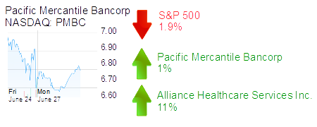 Costa Mesa-based Pacific Mercantile Bancorp was up 1% in a down market to $6.80 and a $156 million market cap.
