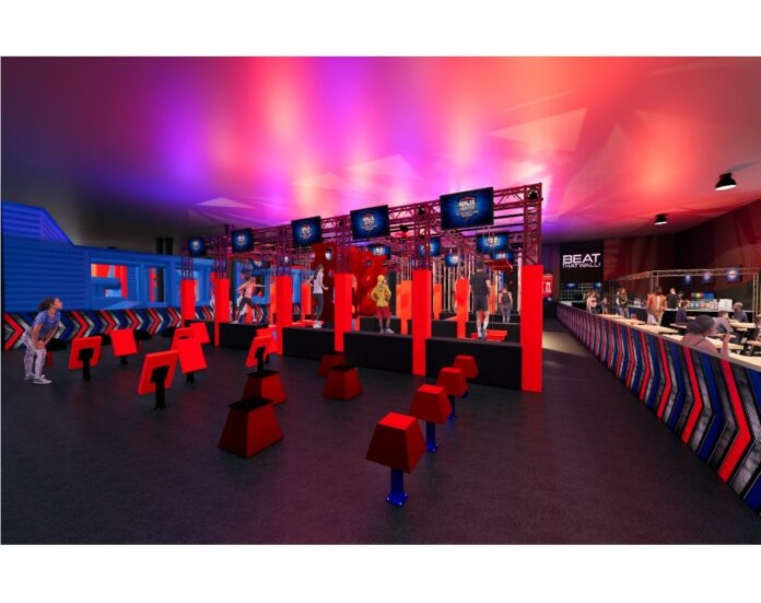 The 17,000-square-foot location, slated to open July 8, is modeled after the NBC competition show in which contestants navigate obstacle courses including “monkey swings, spider walls, tilting logs and floating bridges.”