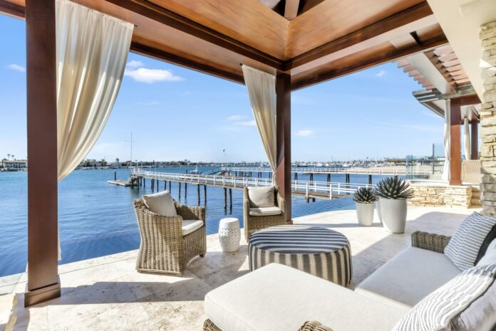 The 2033 Bayside Drive property boasts a Polynesian design—by Newport Beach architect Brion Jeannette—which highlights the home’s bayfront view.