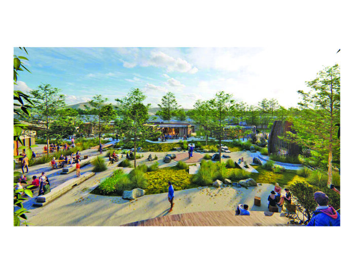 The commercial portion will have 14 separate structures organized around a series of gardens that would include areas for outdoor dining, a creek trail, musical performances and community activities.
