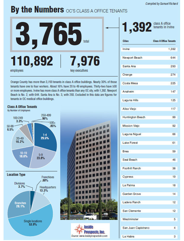 Orange County has more than 3,700 tenants in class A office buildings. Nearly 30% of those tenants have one to four workers. About 16% have 20 to 49 employees. Thirty-two have 500 or more employees. Irvine has more class A office tenants than any OC city, with 1,392. Newport Beach is No. 2, with 644. Santa Ana is No. 3, with 293. Excluded in this data are figures for tenants in OC medical office buildings.
