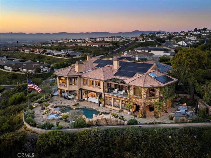 The five-bedroom, 5.5-bathroom residence sits on a 1.4-acre lot with sweeping views of Newport Coast, Pelican Hill Golf Course, the Pacific Ocean, Catalina Island, Newport Harbor, and, on clear nights, city lights visible toward downtown Los Angeles. Nearly every room of the estate offers these views, according to the listing.