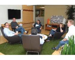 The main conference room is practically a living room with couches, a big-screen TV and video game consoles.