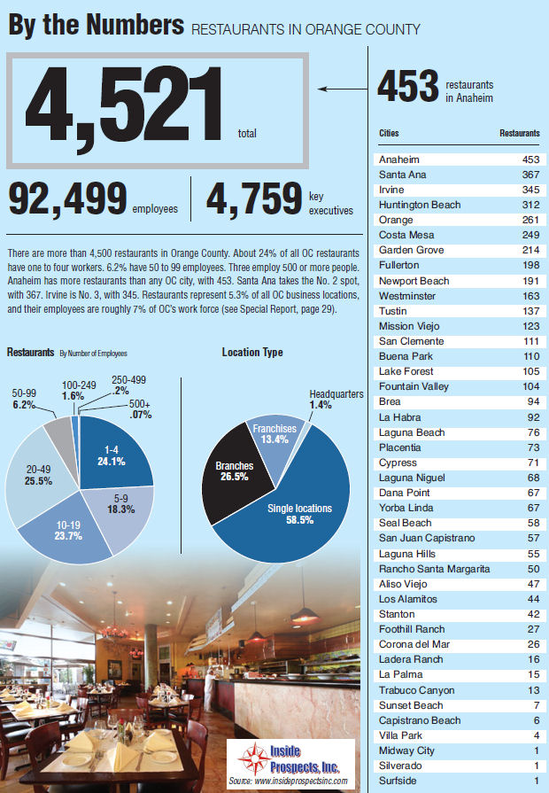 Anaheim has more restaurants than any OC city, with 453. Santa Ana takes the No. 2 spot, with 367. Irvine is No. 3, with 345. Restaurants represent 5.3% of all OC business locations, and their employees are roughly 7% of OC’s work force