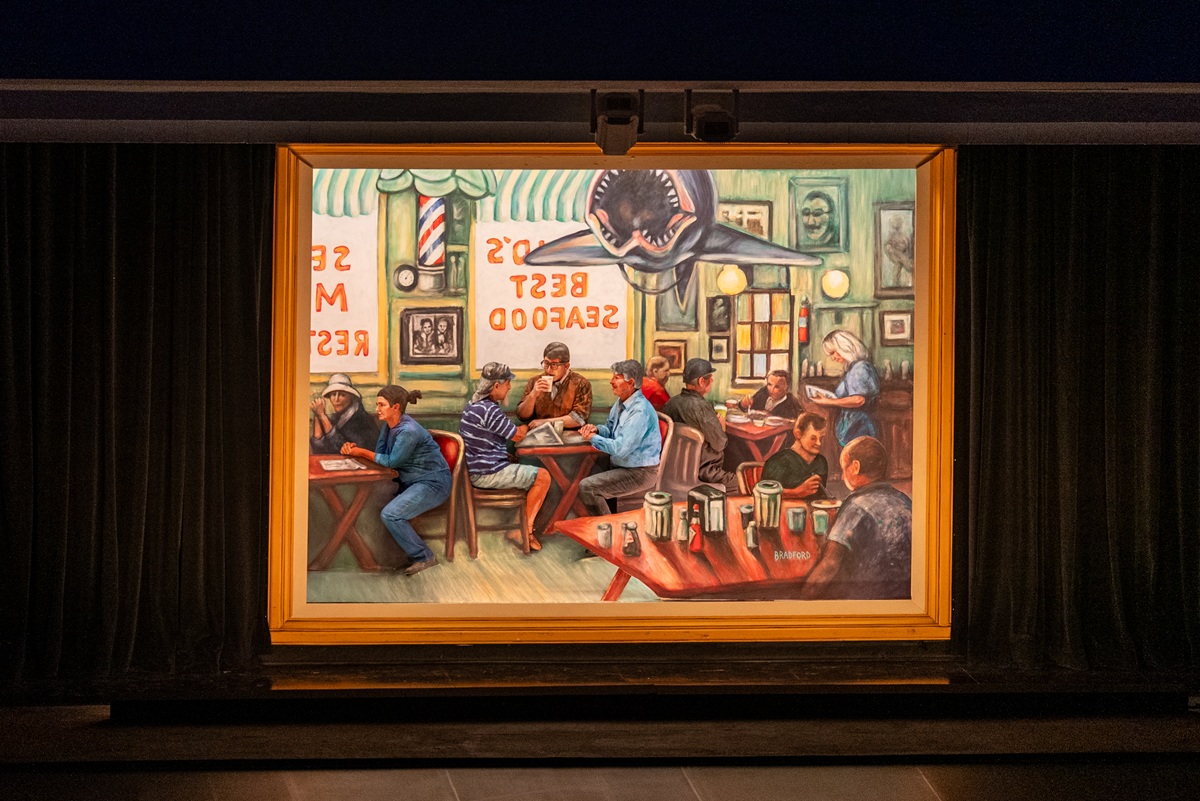 The art collector went a step further and eventually joined the show’s volunteers onstage on July 9 in a painting by artist Bradford Salamon called “Monday at the Crab Cooker.” The oil on canvas features Hilbert, Salamon and another artist Gordon McClelland at the Newport Beach seafood eatery, which also has a second location in Tustin.