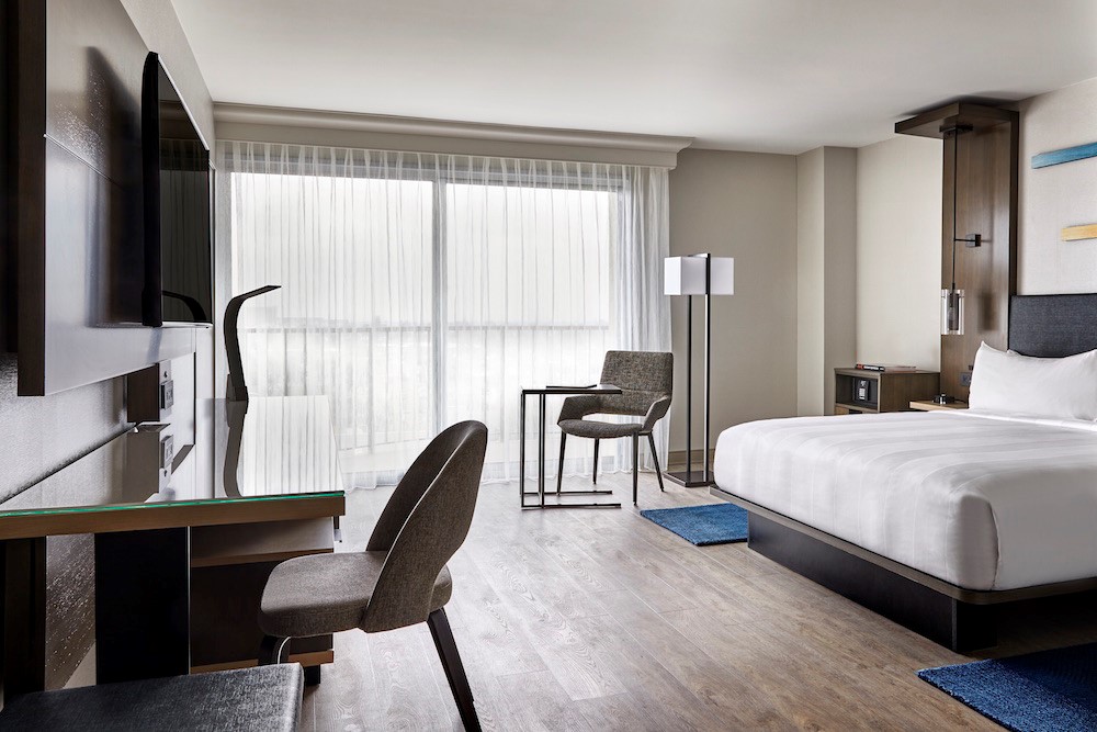 The hotel’s 1,030 rooms were redesigned with modern furnishings in grays and blues for its largely business travelers—or “executive nomads” in Marriott lingo.