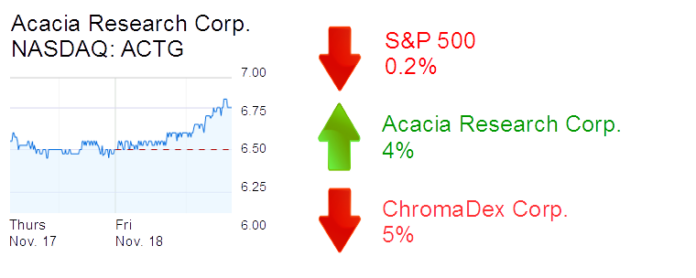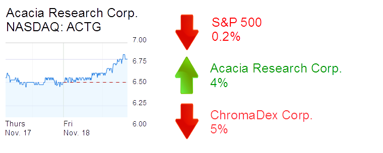 Newport Beach-based Acacia Research Corp. was up 4.2% to $6.77 and a $342 million market cap. The patent licensing company said two of its subsidiaries have new agreements with HTC Corp.