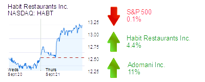 Habit Restaurants Inc. (NASDAQ: HABT) in Irvine was up 4.4% to $13.20 and a $343 million market cap on above-average volume. Habit runs a chain of fast-casual hamburger restaurants.