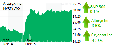 Irvine-based Alteryx Inc. (NYSE: AYX) increased 3.6% to $25.45 and a $1.51 billion market cap. Executives of the maker of data analytics software are scheduled to make a presentation today at the Raymond James 2017 Technology Investors Conference in New York.