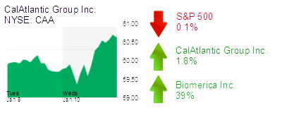 CalAtlantic Group Inc. (NYSE: CAA) in Irvine was up 1.8% to $60.82 and a $6.7 billion market cap. The home builder and developer reported selected results for its fourth quarter and full year: CalAtlantic said net new orders, backlog, and backlog margins improved and incentives offered declined.