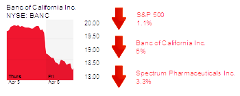 Banc of California Inc. (NYSE: BANC) in Santa Ana was down 5% to $18.38 and a $930 million market cap on high volume. A “shareholder rights” law firm said it was investigating officers and directors of the bank holding company.