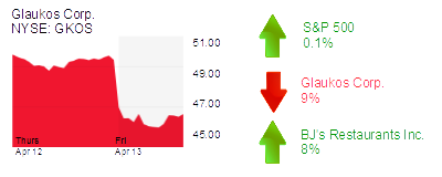 Glaukos Corp. (NYSE: GKOS) in San Clemente was down 9% to $27.93 and a $970 million market cap. Stifel Nicolaus downgraded the glaucoma stent-maker’s shares to “hold” from “buy” and cut its price target to $32 from $39. The analyst cited a survey of eye doctors who said they planned to use competing products once those are approved for use, which could erode Glaukos’ market share.