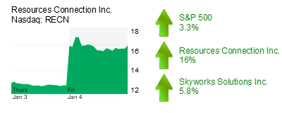 Resources Connection Inc. (Nasdaq: RECN) shares jumped 16% to $15.76 with a market cap of $497 million. The Irvine-based consulting company yesterday reported second quarter earnings of 33 cents per share, beating analyst estimates of 23 cents per share. Revenue was $188.8 million, up 20% year-over-year.